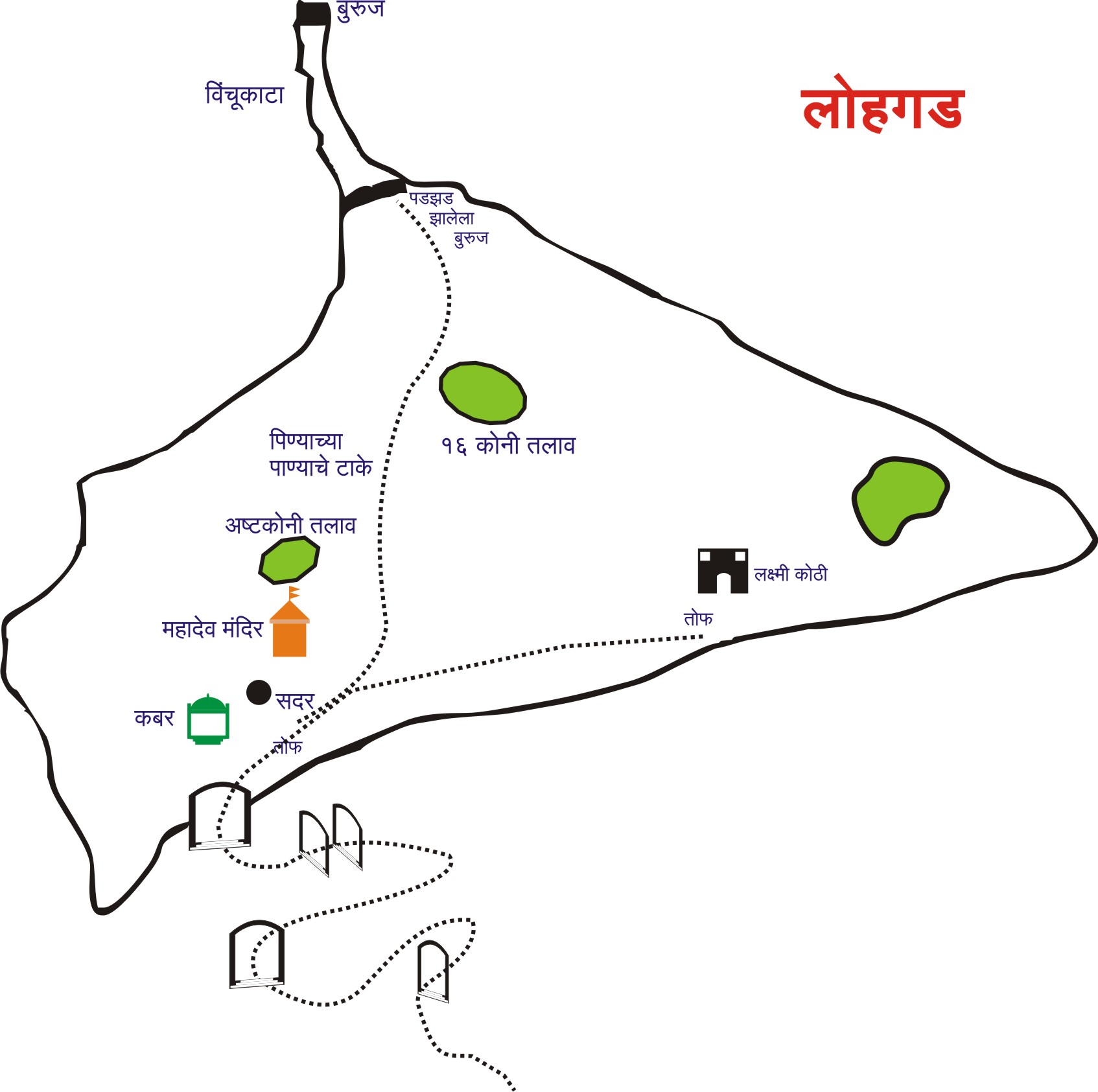 गडावर पहावयाची ठिकाणे : गडावर गड बांधण्यापुर्वीचा भूमीपूजनाचा मोरया धोंड