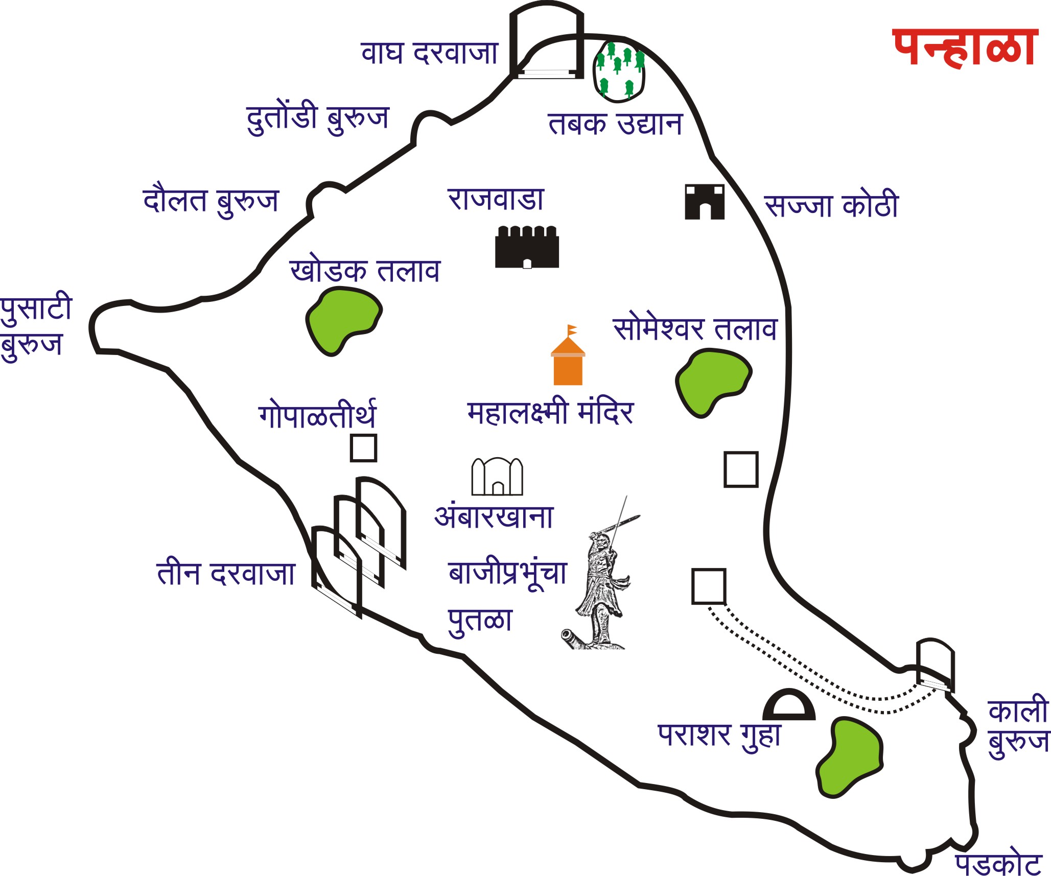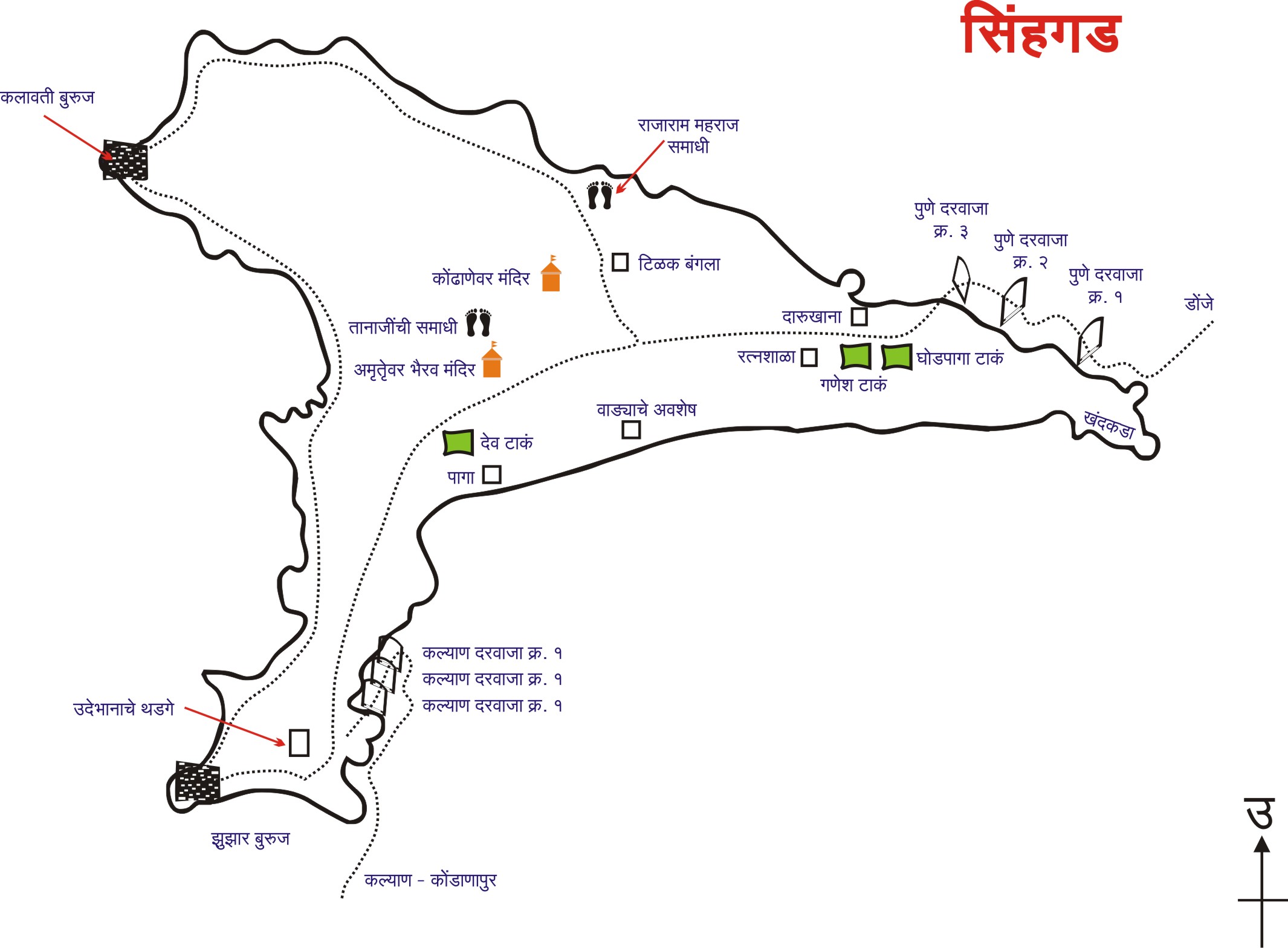 मंदिर , नरसिंह मंदिर, रामकडा , कल्याण दरवाजा , पुणे दरवाजा, म्हसोबा , उदेभानाचे