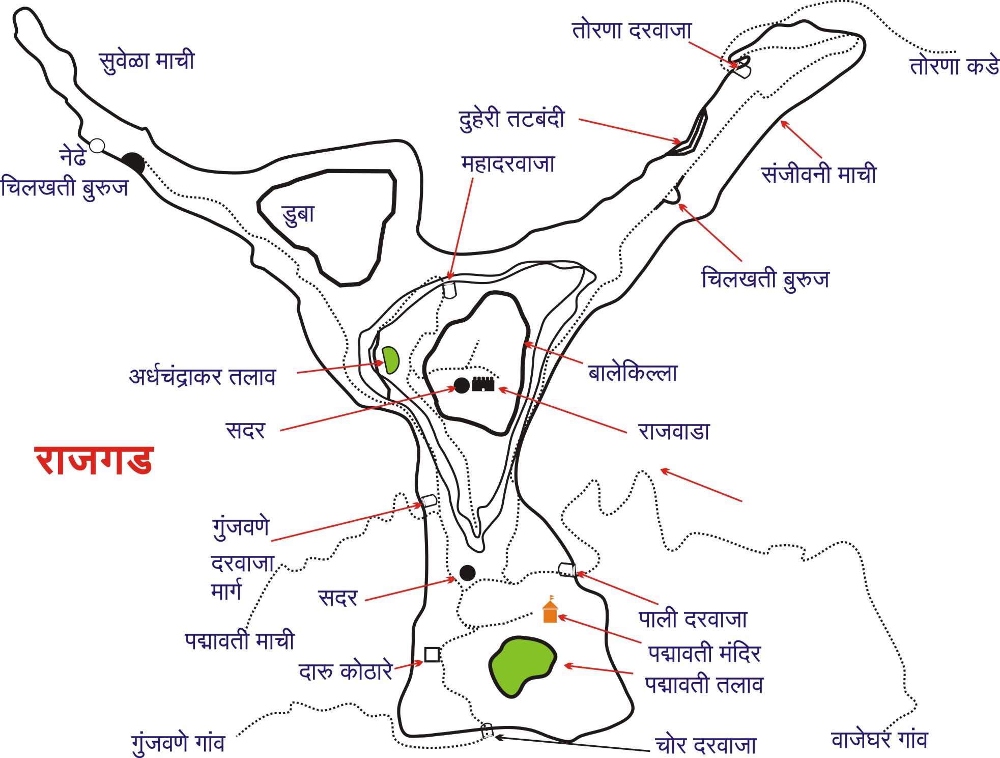 गडावर पहावयाची ठिकाणे : मारुती मंदिर , महाद्वार , किल्ले सदर , दारुकोठार