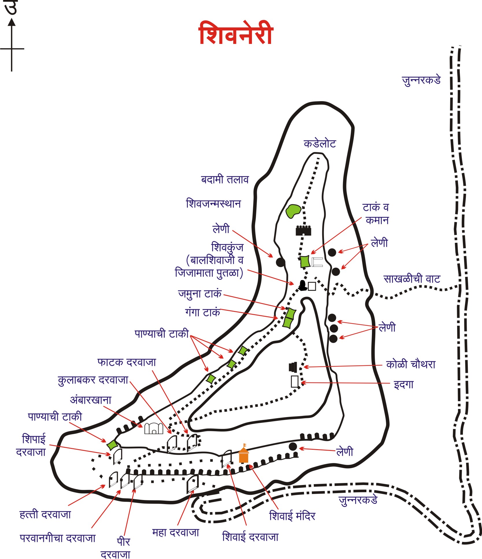 २) जुन्नर शहरात शिरल्यानंतर शिवपुतळ्यापासून डाव्या बाजूच्या डांबरी रस्त्याने चालत