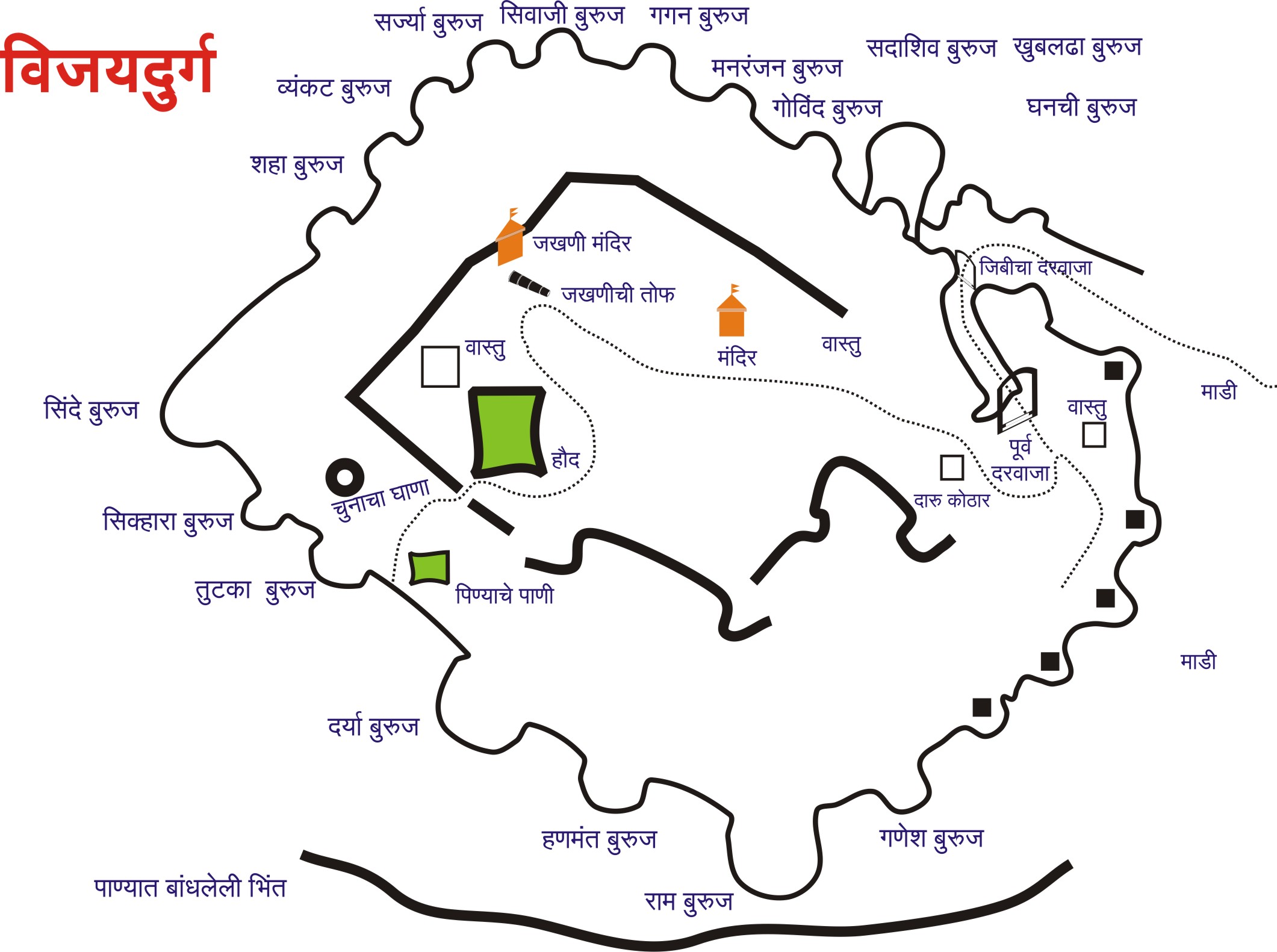 , कोळी चौथरा , कडेलोट टोक ,हमामखाना इत्यादी वास्तू गडावर पहावयास मिळतात.